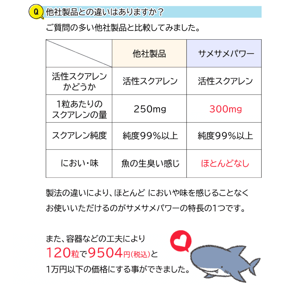 深海ザメの肝油を精製・脱臭、純度99%以上の高品質スクアレンを使用。