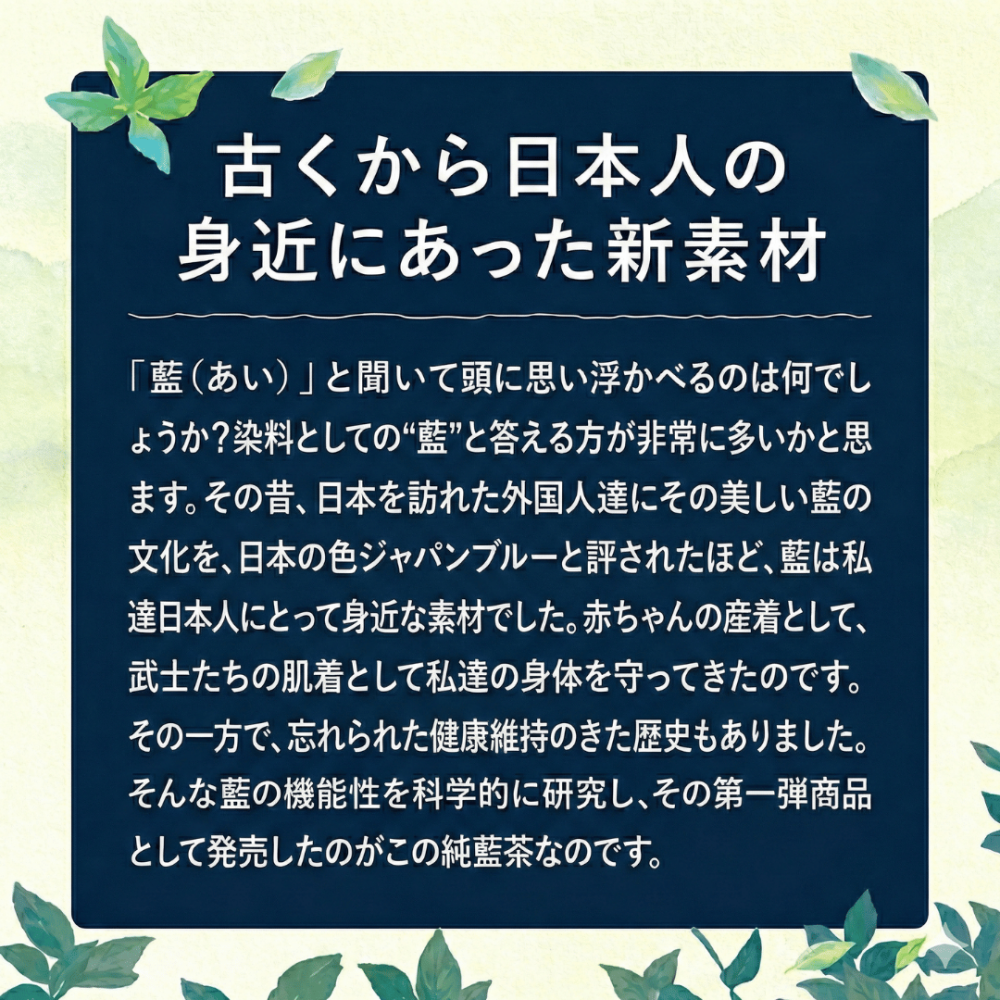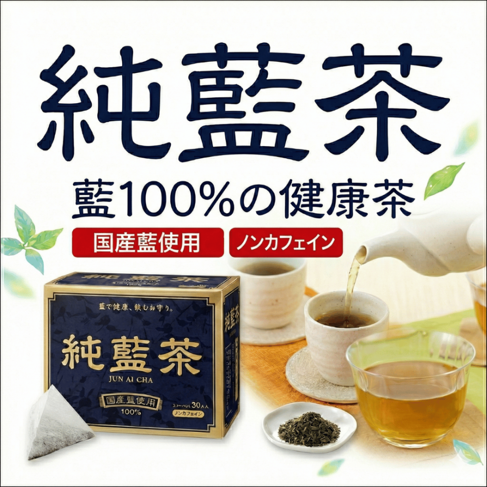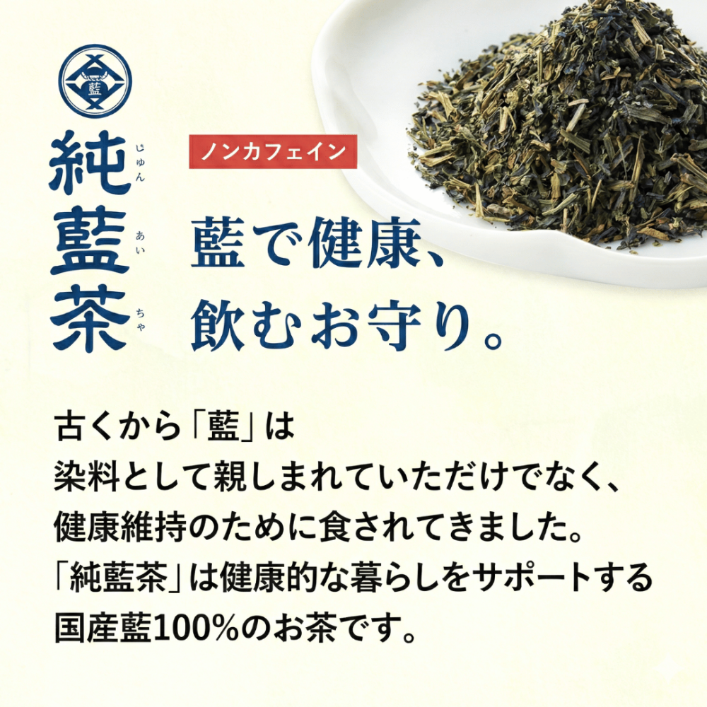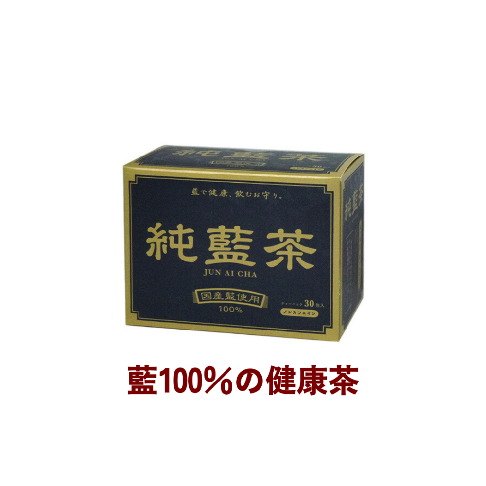 純藍茶は、国産タデ藍の茎と葉だけを使用した100%藍の健康茶です。